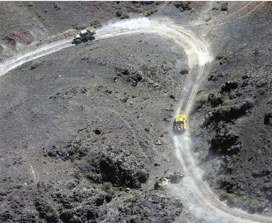 6月30日,2015中国环塔(国际)拉力赛暨中国越野系列赛新疆站结束第七赛段比赛。第七赛段为乌伦古湖赛段,途中经过雅丹地貌与小型湖泊构成的“海上魔鬼城”,山水辉映、风景独特。 新华社发