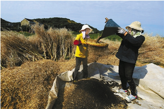 金塘岛仙居社区海港村民在收获油菜籽。