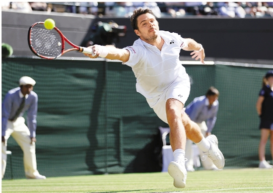 7月6日,在2015温布尔登网球公开赛男单第四轮比赛中,4号种子瑞士选手瓦林卡3比0战胜比利时选手格芬,晋级八强。图为瓦林卡在比赛中回球。 新华社发