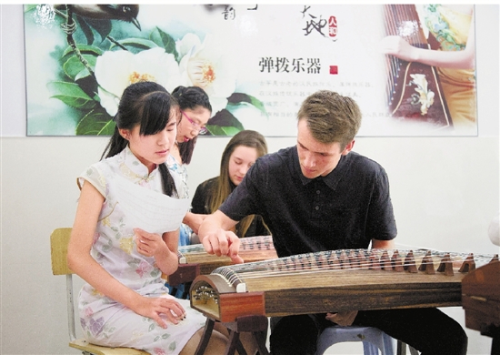 7月7日,20多名来自比利时歌妮皇家中学的学生,正跟着“小老师”学弹古筝。该校与长兴中学是友好学校,体验中国民乐是他们来长兴交流活动的一部分。