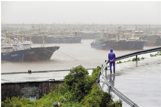 7月11日凌晨5时许,温岭小沙头村一位渔民站在渔港边观台风情况,他刚刚在疾风暴雨中为自己的船只加固了缆绳。