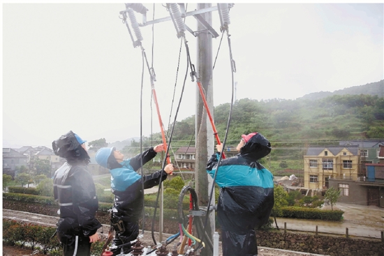 7月11日,象山新桥供电所工作人员冒着风雨在黄吉岙村一临时基建变电站抢修供电。受“灿鸿”影响,今天象山风雨交加。