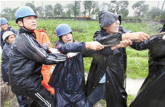 7月11日中午,宁波鄞州供电公司洞桥供电服务站党员抢险突击队员正在石臼庙村扶正被暴风雨冲斜的5根电线杆,保障该村600余用户正常供电。当天,该供电公司12支党员抢险突击队的450余名队员转战在全区各乡镇、水库、排涝站等,力保全区电力线路畅通。