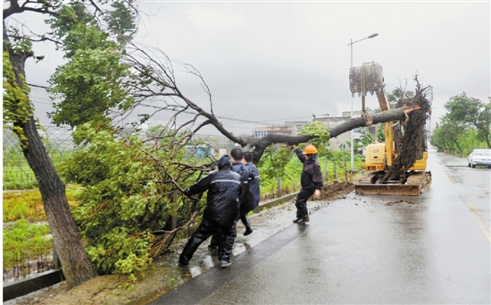 7月11日,岱山县东沙镇工作人员在高东线清理被大风刮倒的行道树。 沈磊 摄