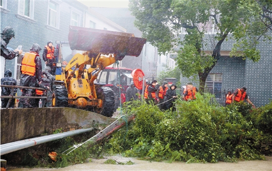7月11日,在象山县丹东街道河西村,一棵树木被狂风连根拔起,横倒在河道中。县民兵应急分队及时清除树木,疏通河道行洪。 本报记者 魏志阳 县委报道组 俞莉 陈光曙 摄