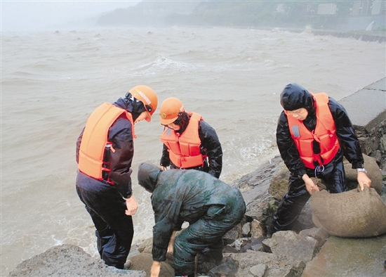 7月11日,普陀区桃花镇三防指挥部组织突击队,用沙包堵住后沙头村海堤的一个决口。 邢学火 摄