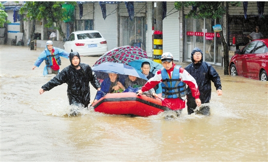 7月11日,民间救援队“公羊队”用冲锋舟帮助运送下管镇被水围困的村民。