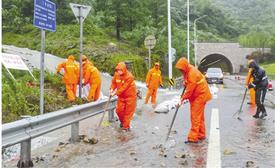 北仑交通职工冒雨抢修道路。 索向鲁 金旭孟 赵文娟 摄
