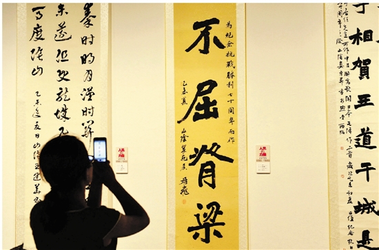 7月15日,“人民的力量——纪念抗日战争70周年书法展”在浙江美术馆开幕,展览通过200余件反映抗战的诗词文赋书法作品,反映抗战历史,展示英烈精神和人性光芒。 龙巍 叶寒青 摄