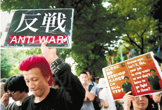 7月15日,在日本东京,人们手举标语参加反对安倍晋三和安保法案的游行。 新华社发