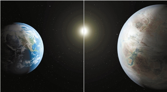 这是美国航天局7月23日公布的地球(左)和太阳系外行星开普勒-452b的对比概念图。 新华社发