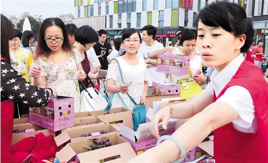 日前,余姚的党员志愿者在广场设摊,帮助种植户销售农产品。 胡建华 戚劲杉 摄