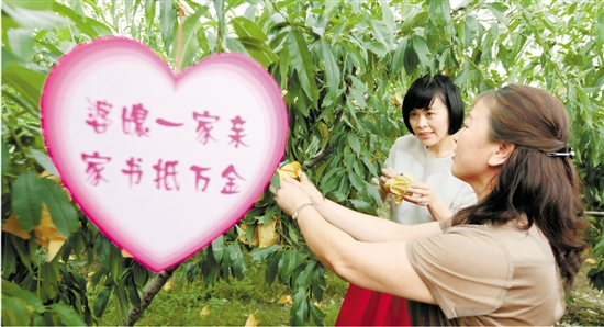 上两图为徐丽娜(左)和傅珠秀给各自的婆婆和儿媳读家书,下图为活动现场摘蜜桃。