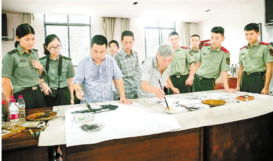 日前,缙云县文联组织当地的12位知名书画家为县消防队官兵们现场作画挥毫,为部队官兵们送去了一份浓浓的精神食粮和八一节的问候。 夏浩坚 摄