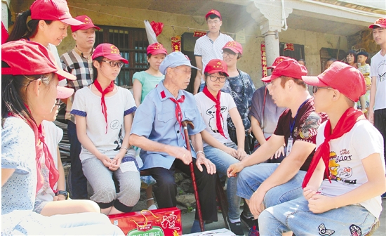 7月31日,温岭市松门镇朝阳村,86岁的老兵林春梅为学生们讲述革命战斗故事。 斯信忠 江文辉 摄