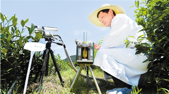 7月31日,在杭州西湖景区梵村的中国农科院茶叶研究所茶叶基地,科研人员冒着高温用光合仪采集数据,研究龙井茶在高温天的光合作用。