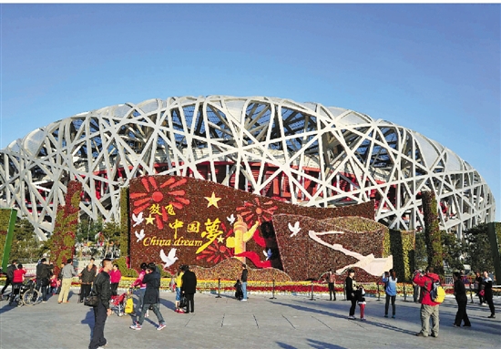 2013年10月15日,游人在“鸟巢”(国家体育场)外游览。