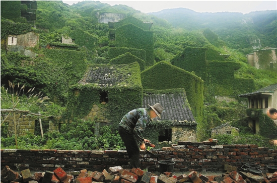 一位重回村里的村民在修葺屋墙。远处是“无人村”爬满青藤的民居。