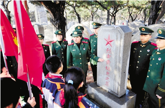 英雄的火种在民间光大弘扬。图为沈阳边防检查站官兵与当地小学生在黄继光烈士墓碑前参加祭奠活动。 新华社发