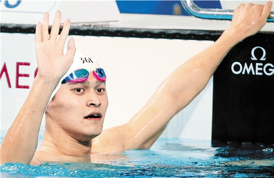8月5日,在俄罗斯喀山举行的第16届游泳世锦赛男子800米自由泳的决赛中,中国选手孙杨以7分39秒96夺冠,实现三连冠。 新华社发