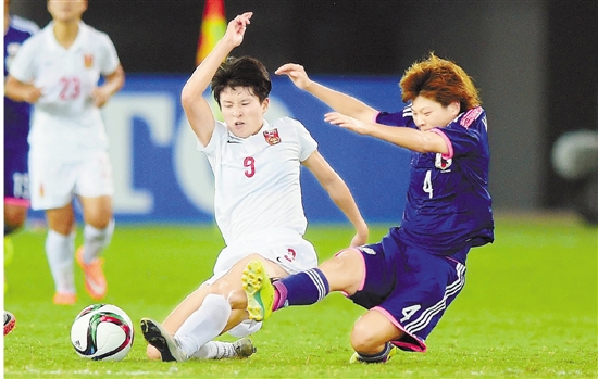 8月8日,中国队球员王珊珊(右二)在比赛中拼抢。当日,在湖北武汉进行的2015年东亚杯女子足球赛第三轮比赛中,中国队终场前连丢两球以0比2负于日本队,三战全负排名垫底。同日,朝鲜队以2比0击败韩国队,三战全胜夺冠。韩国、日本分获第二、第三名。 新华社发