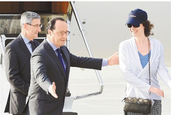 8月7日,在法国巴黎维拉库布莱机场,法国总统奥朗德(左二)迎接获释人质伊莎贝尔·普里梅(右)。今年2月在也门首都萨那被部族武装绑架的法国公民普里梅当天获释并回国。 新华社发