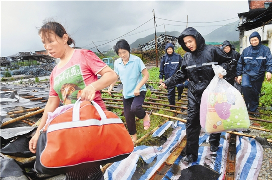 8月8日傍晚,受台风“苏迪罗”影响,平阳县水头镇狂风大作、暴雨如注,江屿社区全体党员干部进村帮助老旧房、简易房里的群众转移到避灾点。 本报记者 吴元峰 通讯员 林炮 摄