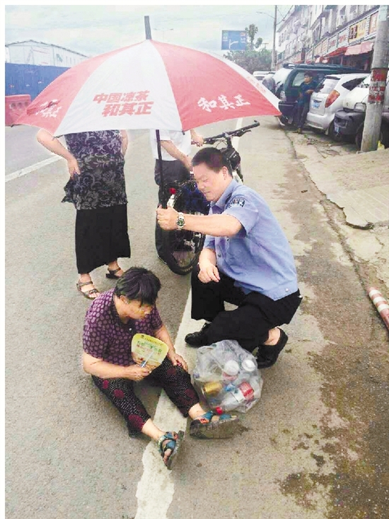 烈日下,民警为昏倒老人撑伞