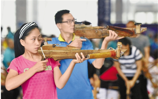 8月10日,民族运动会传统弩混合团体决赛比赛中,偌大的比赛现场只有箭离弦的声音,听不到任何喧哗声。 新华社发