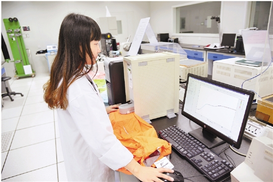 浙江省纺织测试研究院工作人员正在进行防晒服检测。