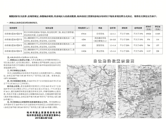 五、本次挂牌出让详细资料请参阅挂牌出让文件。有关挂牌出让文件资料可于2015年8月27日起到杭州市余杭区公共资源交易中心(余杭区临平南大街265号时代广场市民之家三楼)L9号窗口索取。
