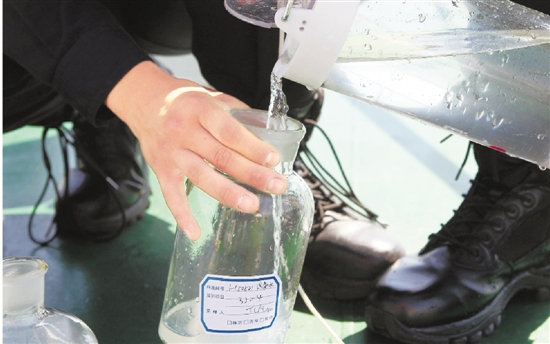 8月21日,天津市环保局工作人员乘坐中国海警天津海警总队巡逻艇出海取水样。 新华社记者 陈益宸 摄