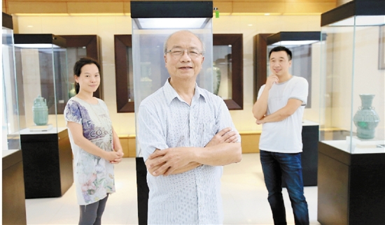青瓷大师之家。中国工艺美术大师徐朝兴(中)和他的儿子、浙江省工艺美术大师徐凌(右),儿媳、浙江省工艺美术大师竺娜亚(左)。