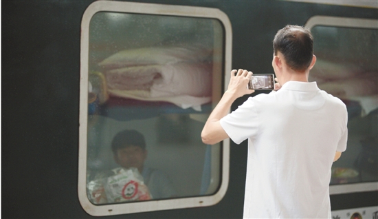 8月21日,大批来杭州和父母团聚的“小候鸟”返乡。图为在杭州城站火车站,一位父亲送别两个回河南的孩子,并为他们拍照留念。