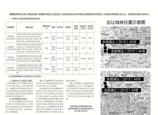 五、本次挂牌出让详细资料请参阅挂牌出让文件。有关挂牌出让文件资料可于2015年9月7日起到杭州市余杭区公共资源交易中心(余杭区临平南大街265号时代广场市民之家三楼)L9号窗口索取。