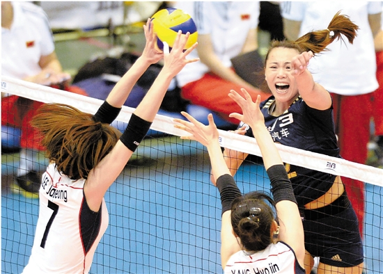 8月26日,在日本长野县松本市举行的2015年女排世界杯第四轮比赛中,中国队以3比1战胜韩国队,取得第三场胜利。目前中国女排成绩为3胜1负。图为中国队球员曾春蕾(右)扣球。 新华社发