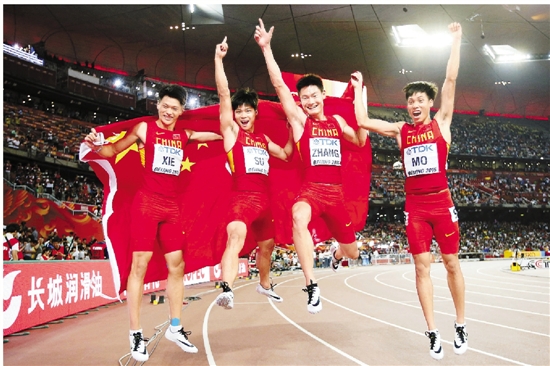 8月29日,中国队选手谢震业、苏炳添、张培萌和莫有雪(从左至右)赛后庆祝。