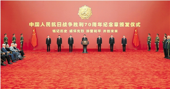 | 9月2日,中共中央总书记、国家主席、中央军委主席习近平在北京人民大会堂向30名抗战老战士老同志、抗战将领、帮助和支持中国抗战的国际友人或其遗属代表颁发中国人民抗日战争胜利70周年纪念章并发表重要讲话。 新华社记者 兰红光 庞兴雷 摄 |