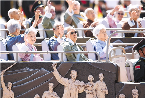 9月3日,中国人民抗日战争暨世界反法西斯战争胜利70周年纪念大会在北京隆重举行。图为抗战支前模范乘车方队。 新华社记者 申宏 摄