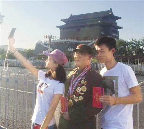 ①7时零5分,受邀观礼代表排队入场,许多人争相和抗日老战士合影。