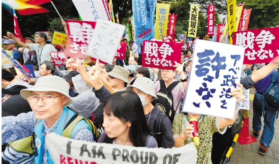 9月18日,在日本东京,民众在国会大楼外手持标语牌抗议强行表决通过安保法案。日本国会参议院和平安全法制特别委员会不顾在野党集体反对和数万民众雨中抗议,17日强行表决通过安保法案。日本各界人士强烈抗议这一行为,要求阻止法案成立。 新华社发