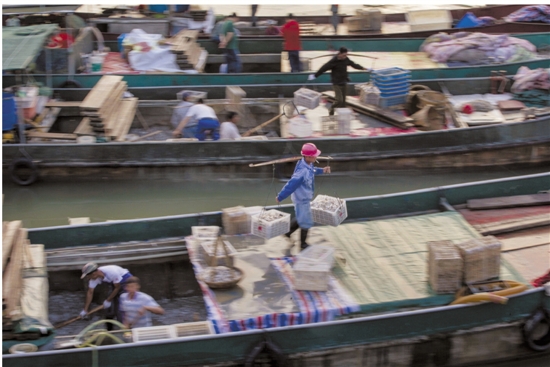 清晨,渔民将从太湖里收获的鲜鱼挑向晒场。