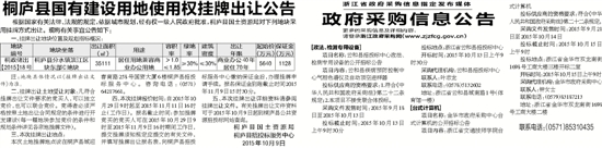 五、本次挂牌出让详细资料请参阅挂牌出让文件。有关挂牌出让文件资料可于2015年10月9日起到桐庐县公共资源招投标网站查询。