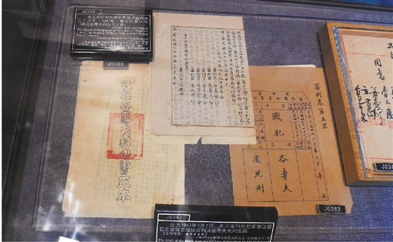 这是侵华日军南京大屠杀遇难同胞纪念馆陈列的《战犯谷寿夫判决书正本》复制件和南京审判战犯军事法庭石美瑜等五位法官判决谷寿夫死刑的底稿(10月3日摄)。 新华社记者 孙参 摄