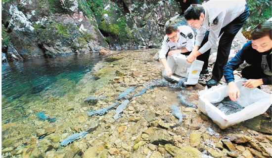 10月23日,开化在大鲵省级水产种质资源保护区水域举行增殖放流活动,952尾大鲵种苗放归大自然。 余问清 摄