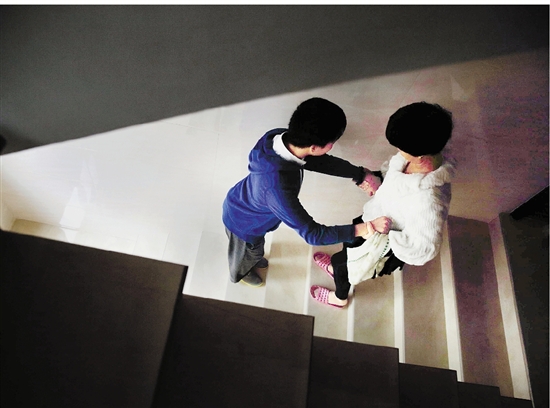 虽然儿子做过手术治疗,但是独立行走依然困难重重,母亲张丽娟不得不扶着儿子上楼。
