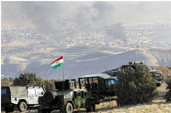 11月12日,在伊拉克北部辛贾尔镇,库尔德武装车辆停在一处高地。 新华社发