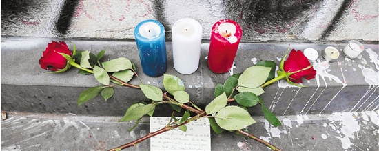 11月14日,人们在法国巴黎共和国广场点燃蜡烛、摆放鲜花,悼念恐怖袭击事件遇难者。 新华社记者 周磊 摄