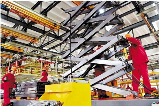 浙江鼎力机械股份有限公司车间里,工人在装配生产线上作业。该公司主要产品有自行走和高空取料平台等6大系列80多个规格的高空作业平台。(资料照片) 本报记者 梁臻 摄