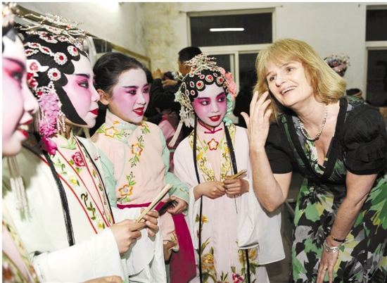 2011年4月8日,来自英国莎士比亚出生地的基金会会长戴安娜·欧文和遂昌的小演员们交流(资料图)。 本报记者 梁臻 县报道组 潘俊 摄